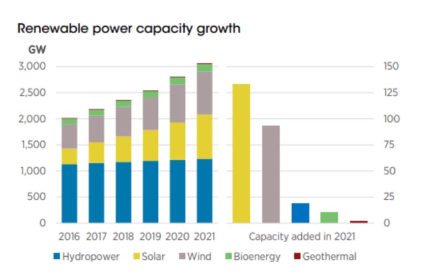 Согласно последнему «Статистическому отчету о производстве возобновляемой энергии за 2022 год», опубликованному Международным агентством по возобновляемым источникам энергии (IRENA), в 2021 году общемировой объем добавленной установленной мощности возобновляемой энергии достиг 257 гигаватт (ГВт), увеличившись на 9,1% в годовом исчислении, в результате чего общемировая совокупная установленная мощность возобновляемой энергии превысила 3 ТВт (3064 ГВт).
