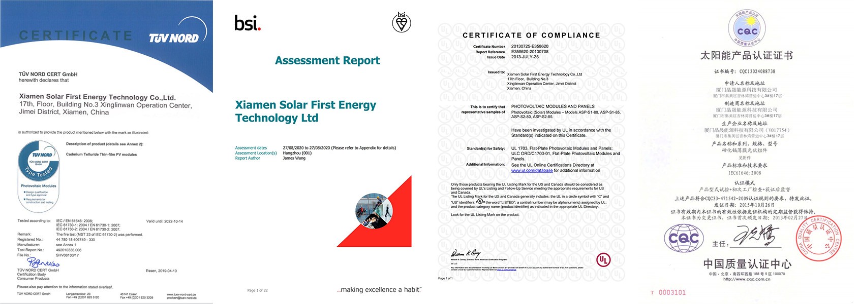 Фотоэлектрическое стекло на основе теллурида кадмия (CdTe) компании Solar First сертифицировано всемирно известными организациями, такими как TUV SUD (TUV), Британский институт стандартов (BSI) и Схема сертификации продукции микрогенерации энергии (MCS).