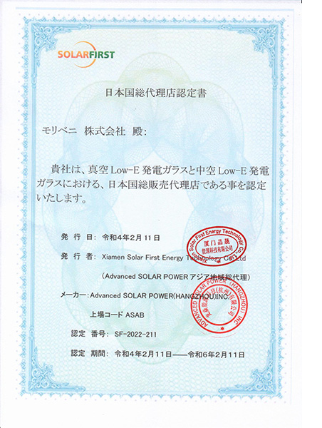 Компания Solar First вышла на японский рынок с передовым вакуумным низкоэмиссионным фотоэлектрическим стеклом BIPV. Стеклянные подложки как для кадмиево-теллуридного фотоэлектрического стекла, так и для вакуумного низкоэмиссионного фотоэлектрического стекла изготовлены из материалов японской компании Asahi Glass, интегрируя передовые японские технологии в собственную высокотехнологичную продукцию.