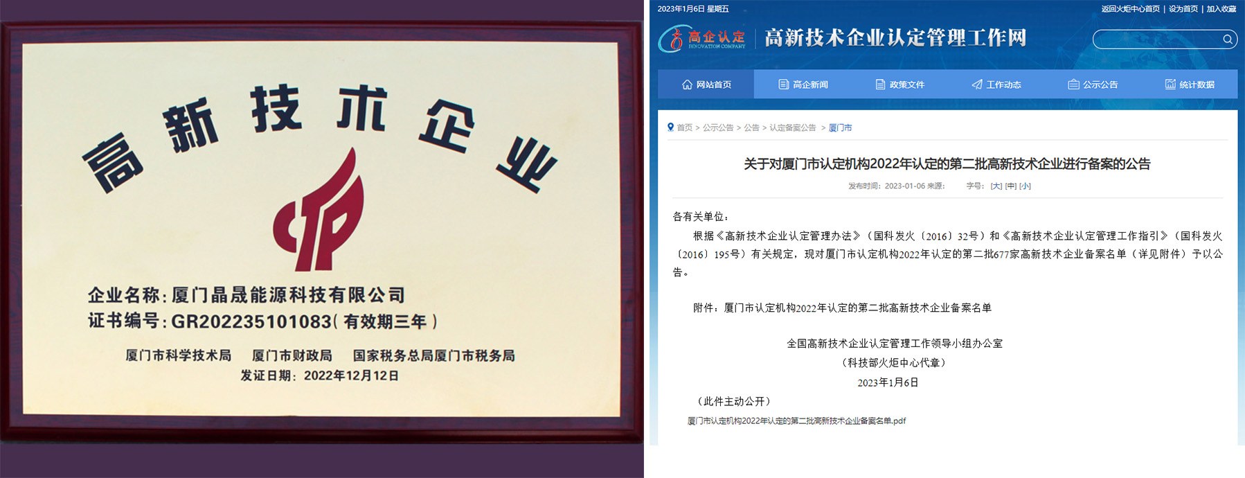 Это достижение стало возможным благодаря почетному сертификату «Национальное высокотехнологичное предприятие», выданному 12 декабря 2022 года Налоговым бюро Сямыня Государственного налогового управления, Научно-техническим бюро Сямыня и Финансовым бюро Сямыня компании Xiamen Solar First Energy Technology Co., Ltd. Этот сертификат является авторитетным национальным признанием достижений Solar First Energy в области научных и технологических инноваций за последние годы.