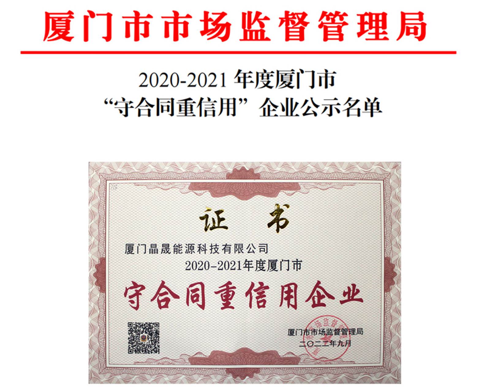 Компания Solar First Group получила сертификат «Предприятие, выполняющее контракты и кредиты» за 2020-2021 годы от Бюро по надзору и управлению рынком города Сямынь. Это престижное признание последовало за недавним получением компанией сертификата «Национальное высокотехнологичное предприятие».