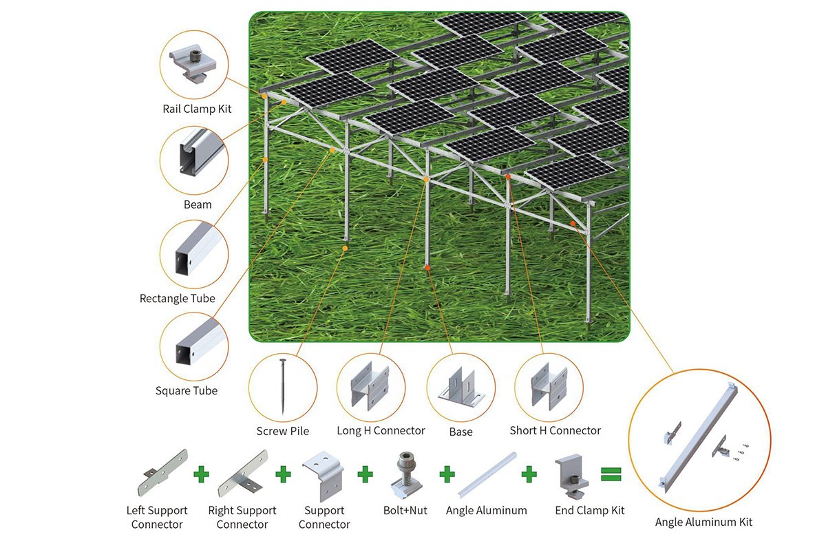 Изготовленная из высокопрочного анодированного алюминия AL6005-T5 и нержавеющей стали SUS304, система обеспечивает отличную коррозионную стойкость и надежность конструкции, выдерживая ветровые нагрузки до 60 м/с и снеговые нагрузки до 1,4 кН/м². Благодаря возможности установки на винтовые сваи или бетонный фундамент, система солнечных панелей на земле проста в установке и экономична.