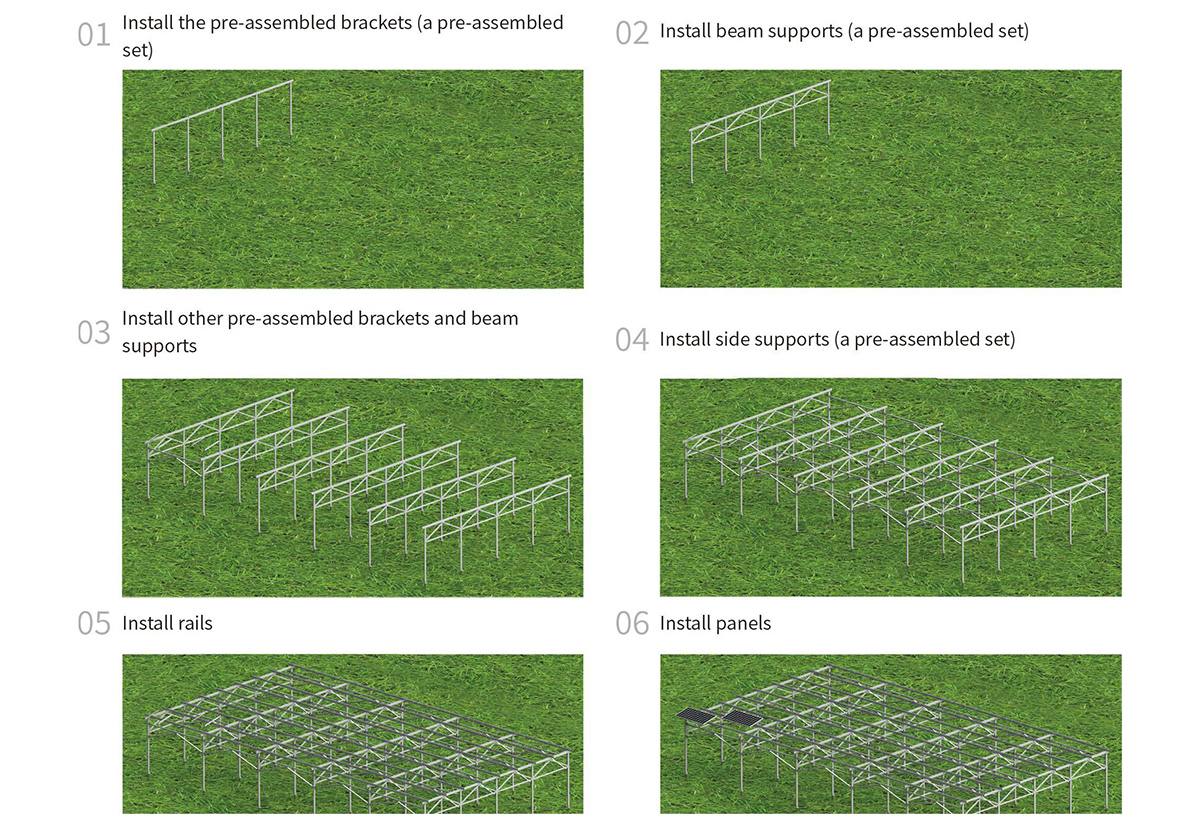Эта система крепления солнечных панелей для сельскохозяйственных объектов спроектирована с учётом гибкости: её можно построить высокой, чтобы под ней могла проходить сельскохозяйственная техника, и установить между рядами солнечных панелей, чтобы солнечный свет достигал растений. Для случаев, требующих полного покрытия, например, в загонах для скота, на фермах по выращиванию грибов или в теплицах, можно спроектировать полностью водонепроницаемую и затенённую конструкцию.