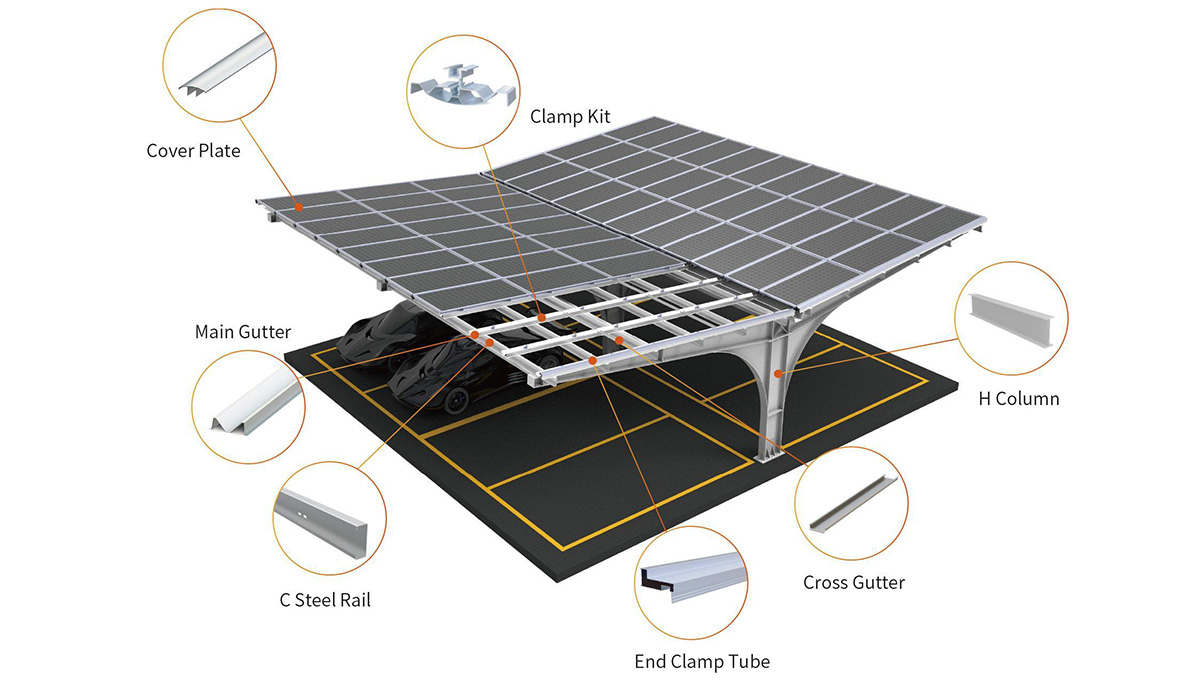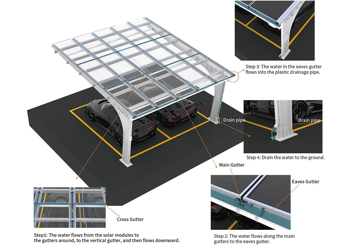 Стальной консольный навес для автомобиля отличается уникальной водонепроницаемой конструкцией, которая эффективно отводит дождевую воду из щелей между солнечными модулями через встроенные дренажные отверстия, трубы и желоба, обеспечивая надежную защиту от непогоды без использования клея или резиновых наполнителей. Его универсальная консольная конструкция легко адаптируется как к наклонным, так и к прямым парковкам, максимально эффективно используя пространство и обеспечивая защиту транспортных средств.