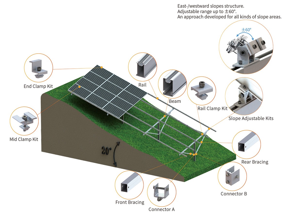 Предварительно спроектированные регулируемые точки крепления позволяют точно настроить установку, учитывая особенности рельефа и расположение модулей. Это крепление для солнечной системы на склоне обеспечивает как структурную гибкость, так и надёжную и безопасную работу.